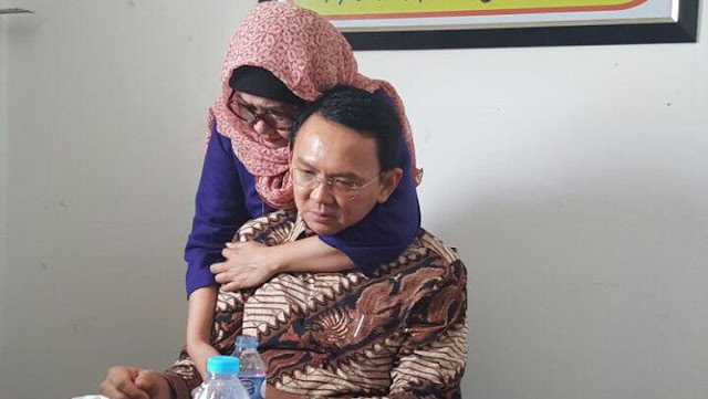 Di belakang Ahok, ada sang kakak angkat yang bernama Nana Riwayatie. Perempuan berjilbab itu memeluk Ahok dari belakang.