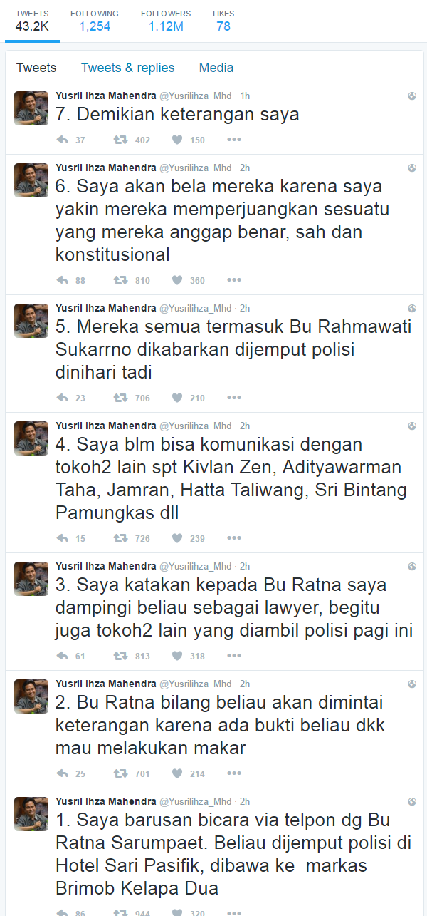 "Saya katakan kepada Bu Ratna saya dampingi beliau sebagai lawyer, begitu juga tokoh2 lain yang diambil polisi pagi ini," cuit Yusril.